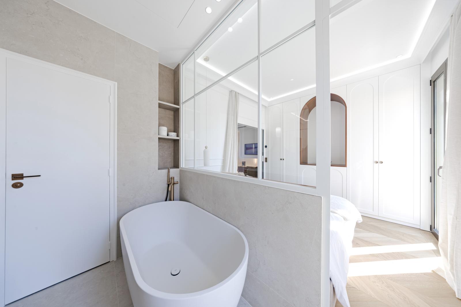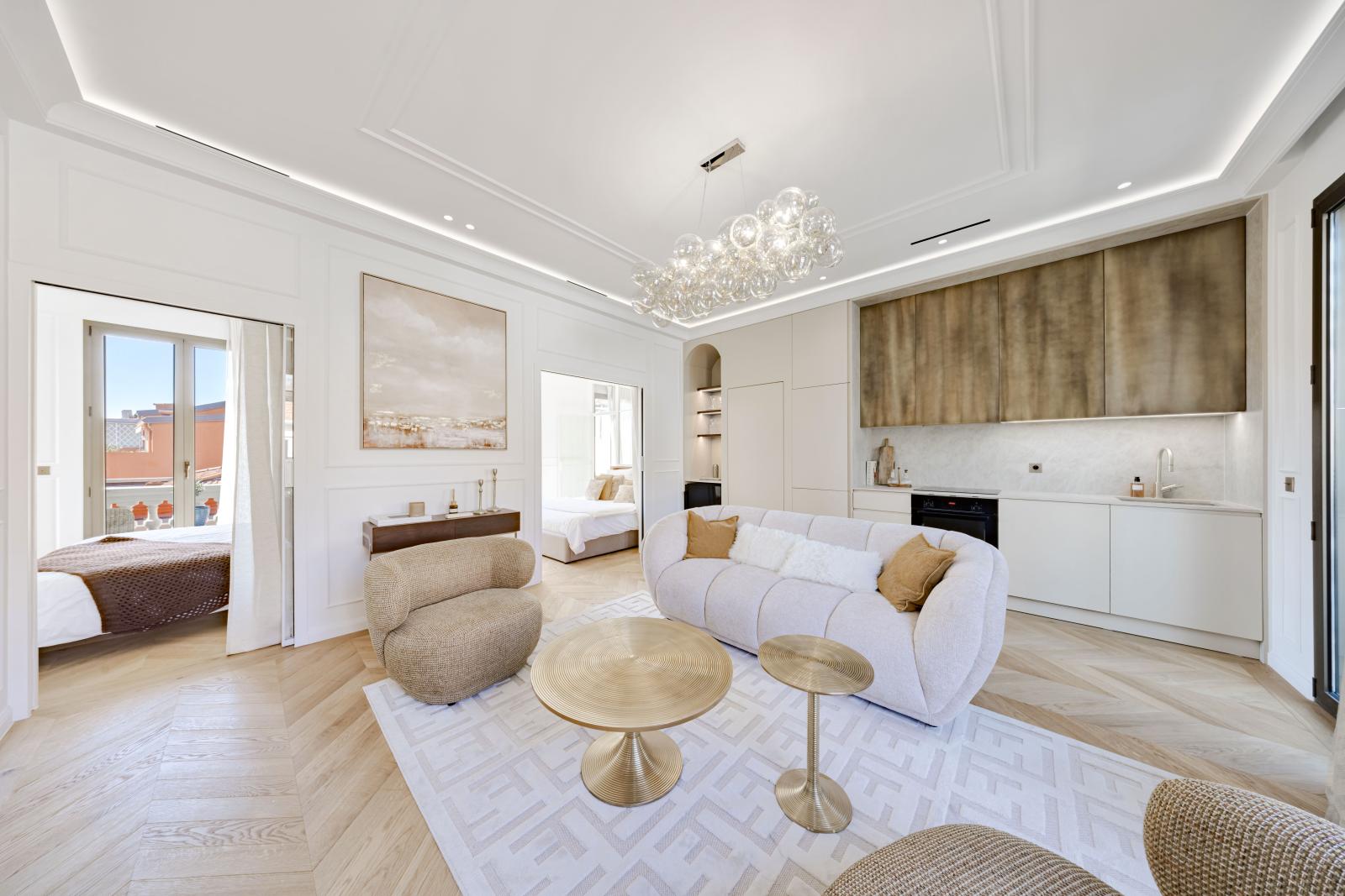 Ce bien d'exception se compose d'un séjour lumineux ouvert sur la terrasse, d'une cuisine équipée avec des finitions de luxe, et d'une spacieuse chambre avec dressing sur mesure. La rénovation complète a été réalisée avec une attention particulière, créant un espace de vie moderne et raffiné.