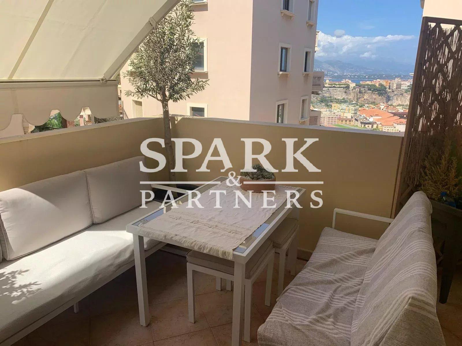 Le bien est complété par une belle terrasse de 17 m2 offrant une vue sur le Rocher de Monaco et la mer, ainsi que par un garage fermé et une cave.