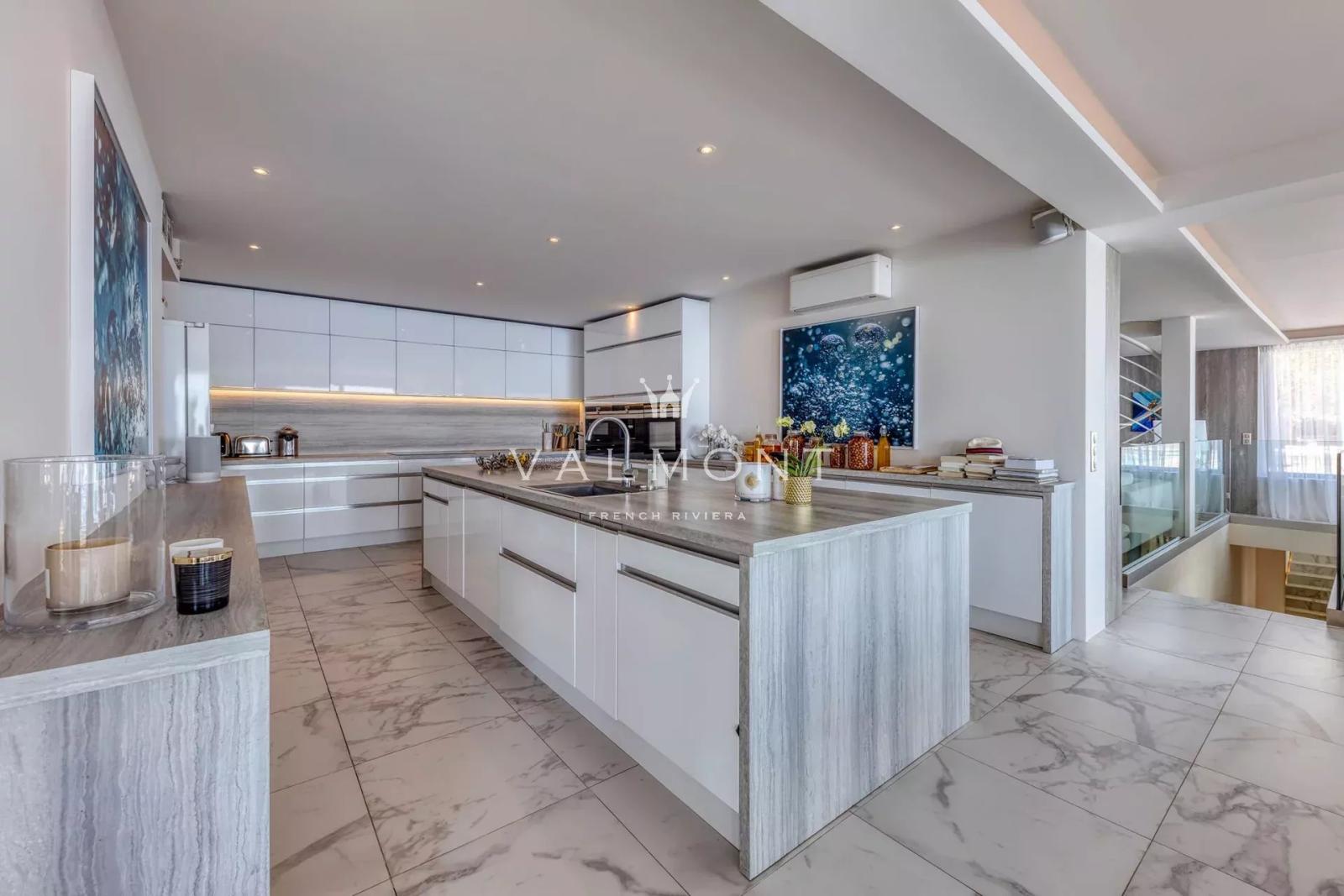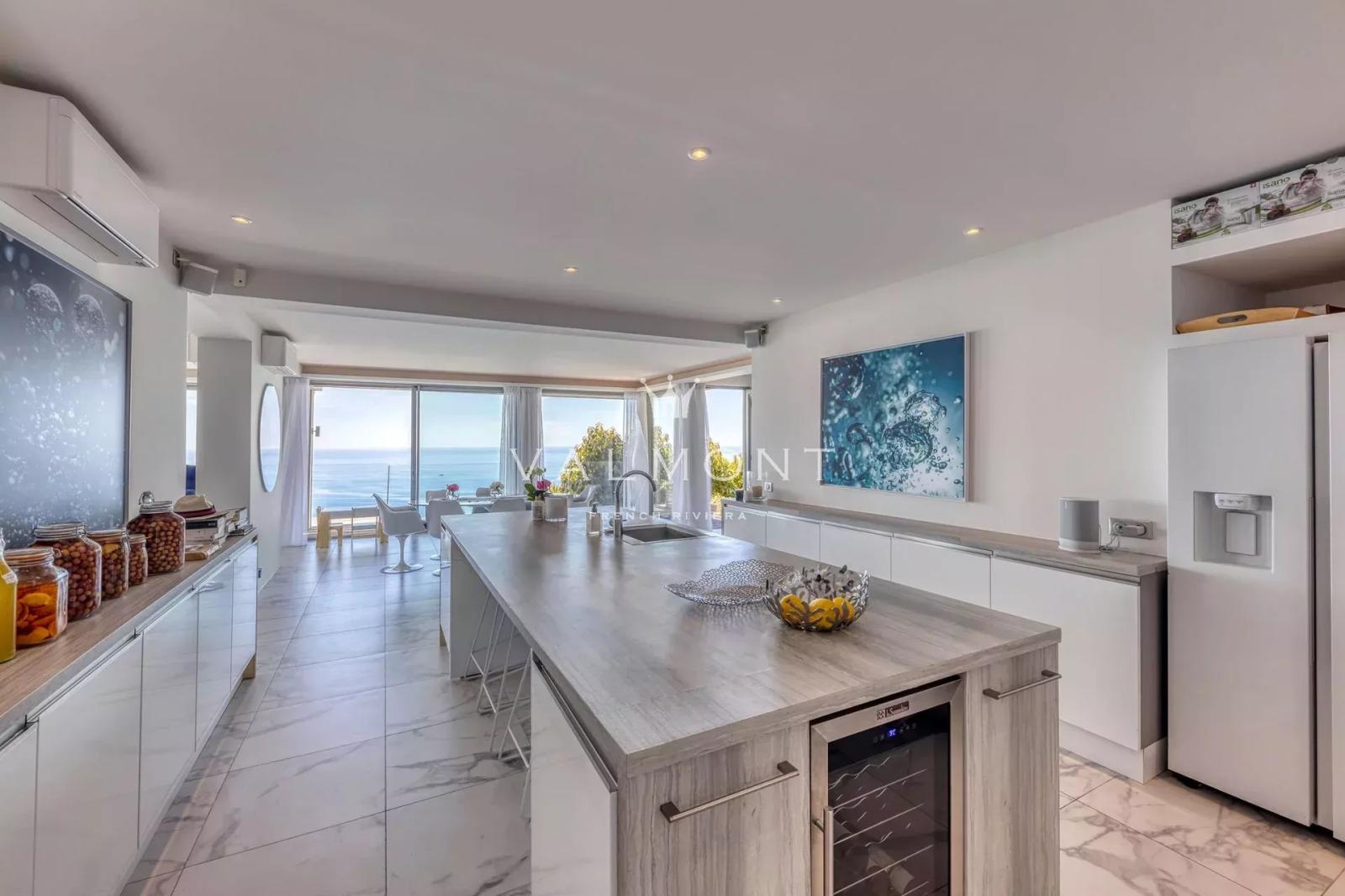 Au cœur de la villa, une cuisine ouverte de haute technologie s'ouvre sur un espace de vie lumineux et spacieux. De larges baies vitrées inondent l'espace de lumière naturelle et offrent une vue imprenable sur la Méditerranée. Le salon principal, équipé de la climatisation, d'une télévision, d'un piano et d'une cheminée, s'ouvre directement sur la terrasse et la piscine, créant un cadre idéal pour recevoir ou se détendre en toute sérénité, au milieu d’oliviers centenaires.
