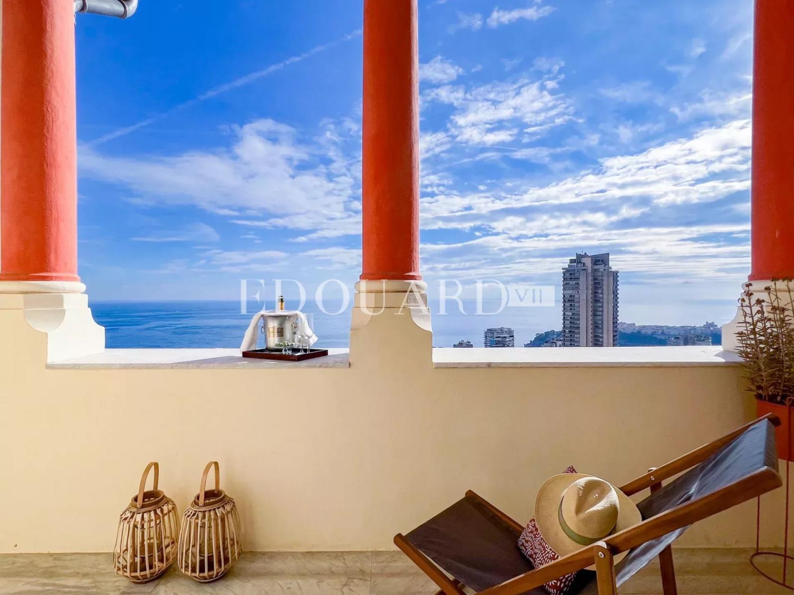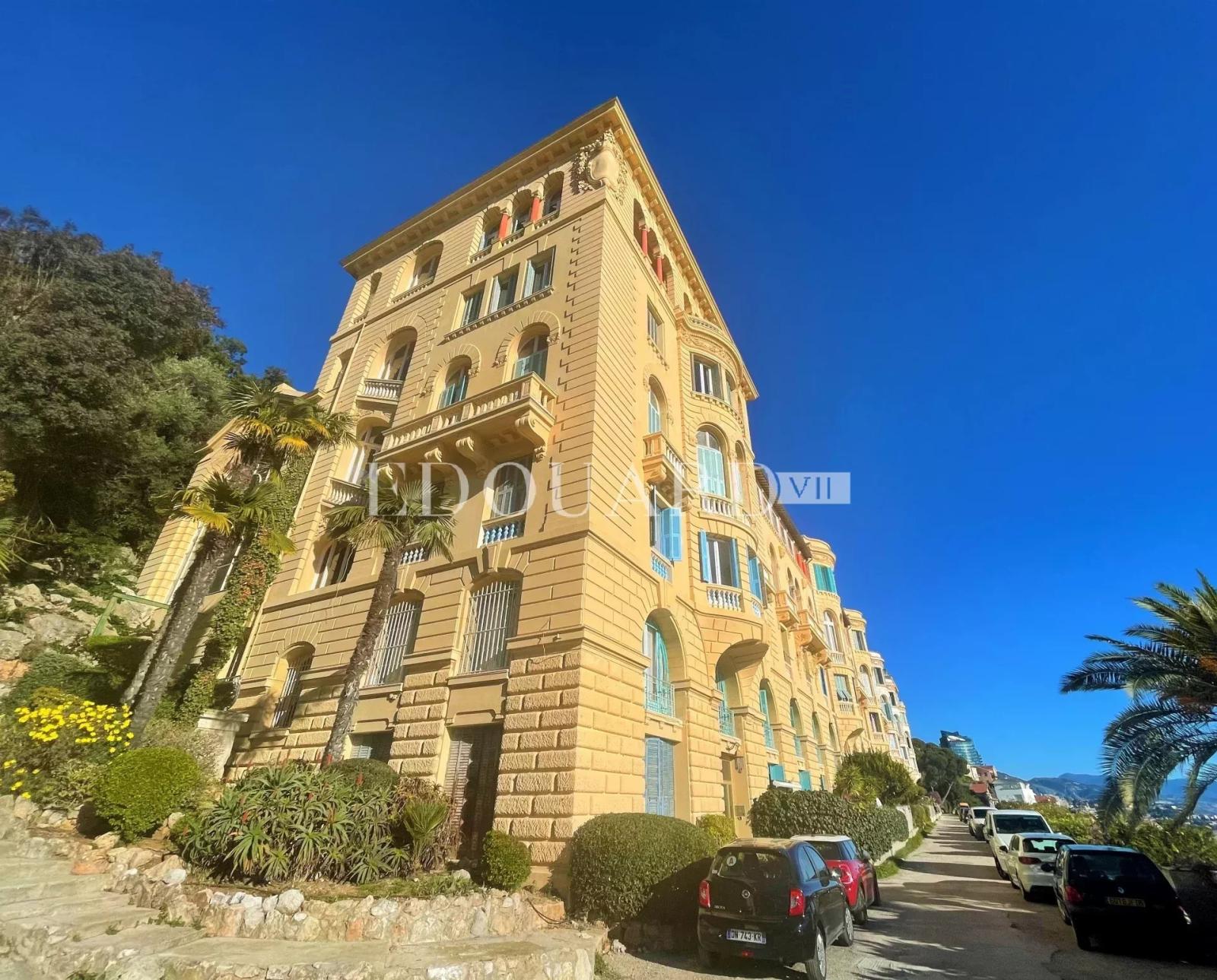 Au quatrième et avant dernier étage d'un magnifique immeuble classé, connu aussi pour la vaste verrière du célèbre ingénieur Eiffel, qui abrite le jardin d'hiver, à vendre superbe appartement de 102 m² avec belle hauteur sous plafonds, ancien parquet au sol, cheminée, plusieurs placards, splendide vue panoramique sur la baie de Monaco, l'Hôtel de Paris et le Casino. Composé d'entrée, grand séjour avec bowindow, cuisine indépendante complètement équipée, joli extérieur, chambre de maître avec vue mer, chambre à coucher, salle de bains, WC séparé, parking collectif. Idéalement exposé Sud, très ensoleillé et au calme.
