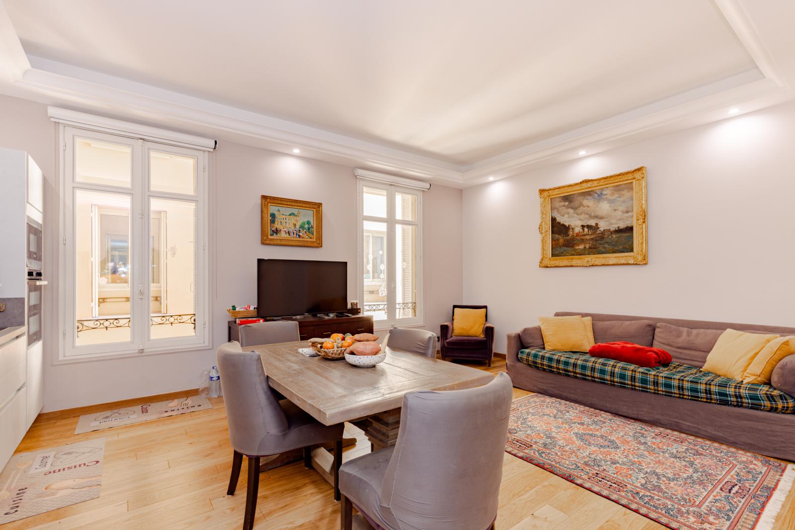 Ce bien d'exception se compose d'un séjour lumineux ouvert sur la terrasse, d'une cuisine équipée avec des finitions de luxe, et d'une spacieuse chambre avec dressing sur mesure. La rénovation complète a été réalisée avec une attention particulière, créant un espace de vie moderne et raffiné.