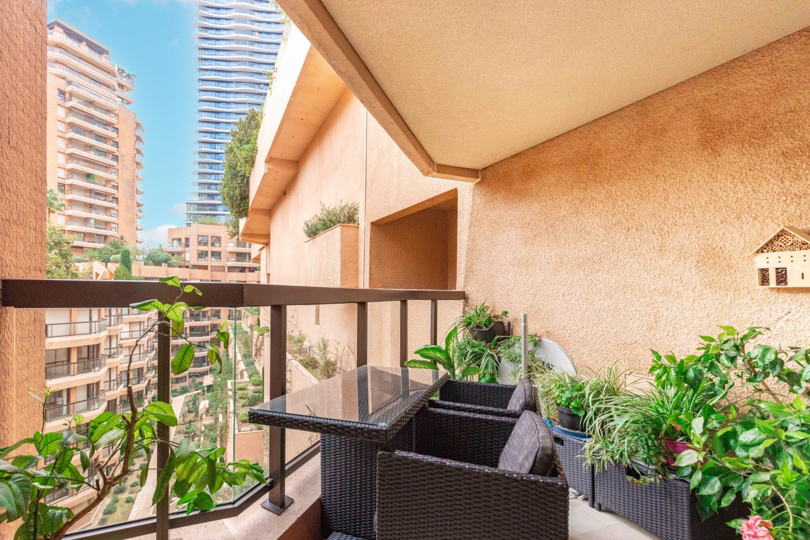 Superbe deux pièces entièrement rénové avec des matériaux haut de gamme, offrant une magnifique terrasse avec vue imprenable sur le Port Hercule, la Méditerranée et le Rocher de Monaco.