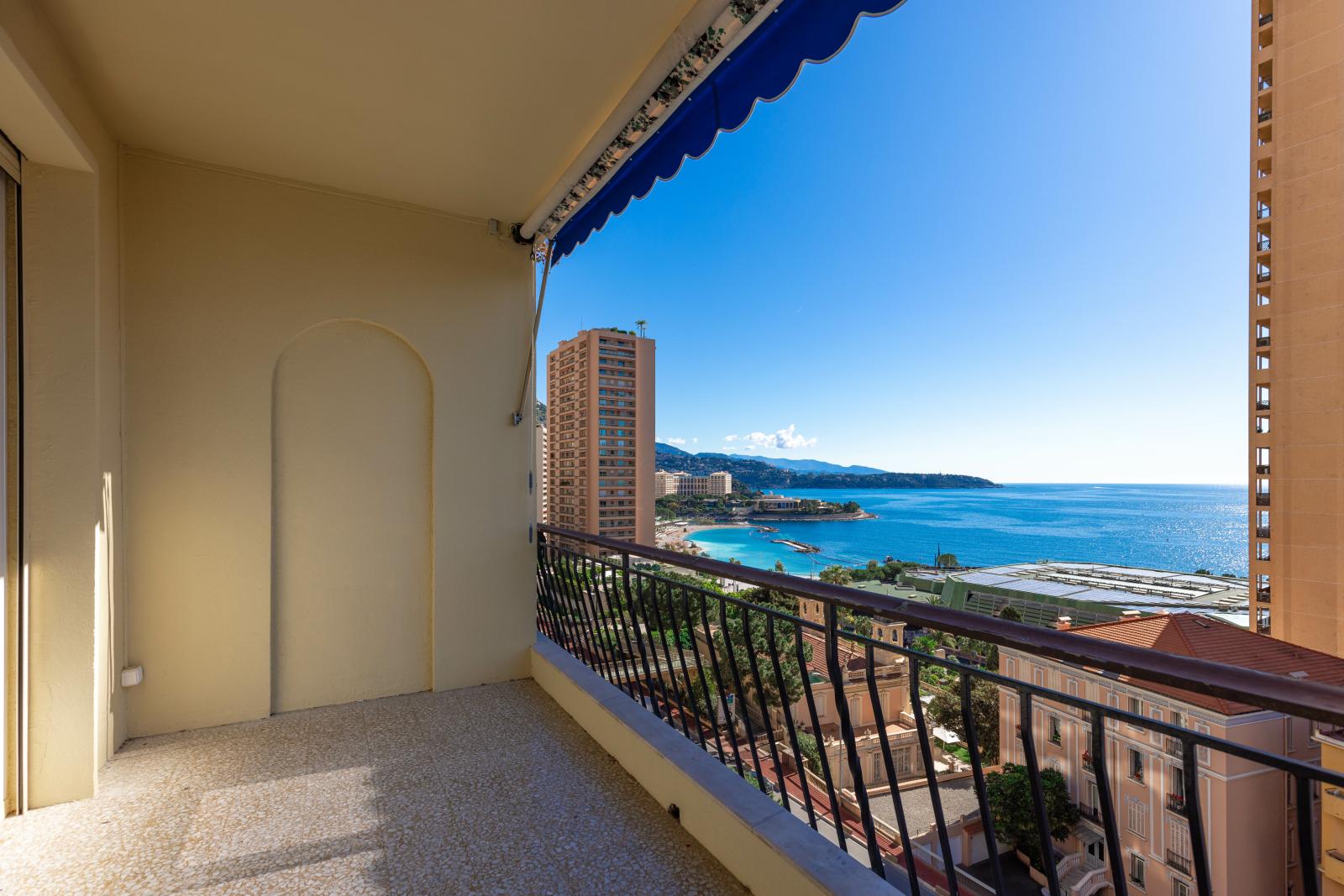 Superbe deux pièces entièrement rénové avec des matériaux haut de gamme, offrant une magnifique terrasse avec vue imprenable sur le Port Hercule, la Méditerranée et le Rocher de Monaco.