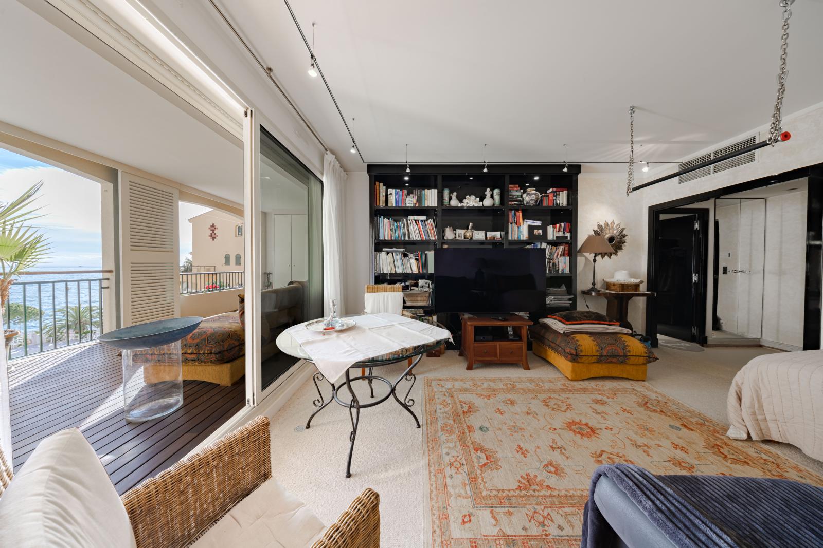 Ce bien d'exception se compose d'un séjour lumineux ouvert sur la terrasse, d'une cuisine équipée avec des finitions de luxe, et d'une spacieuse chambre avec dressing sur mesure. La rénovation complète a été réalisée avec une attention particulière, créant un espace de vie moderne et raffiné.
