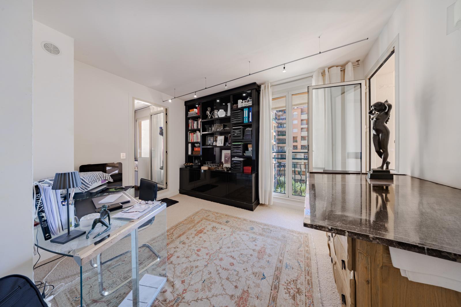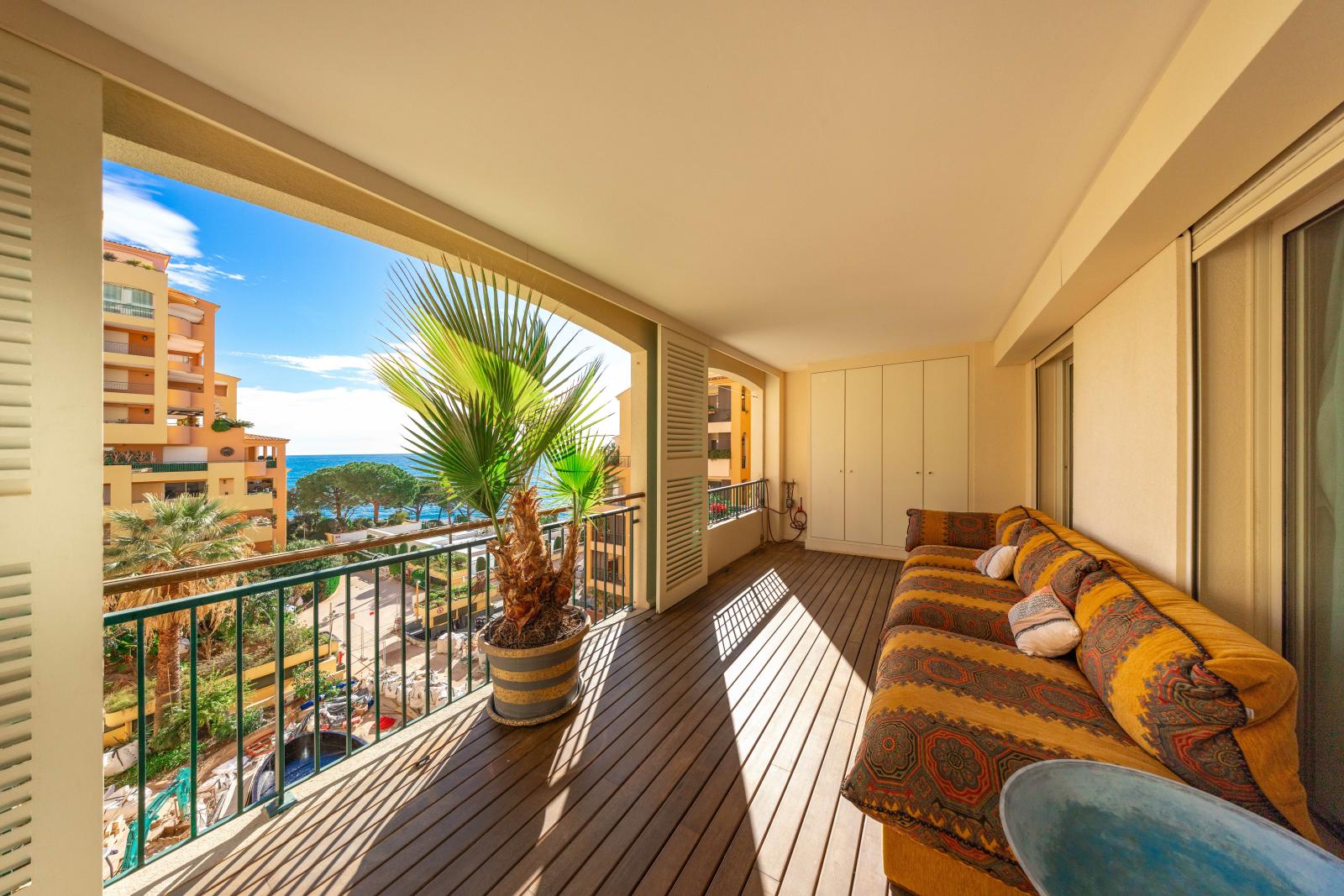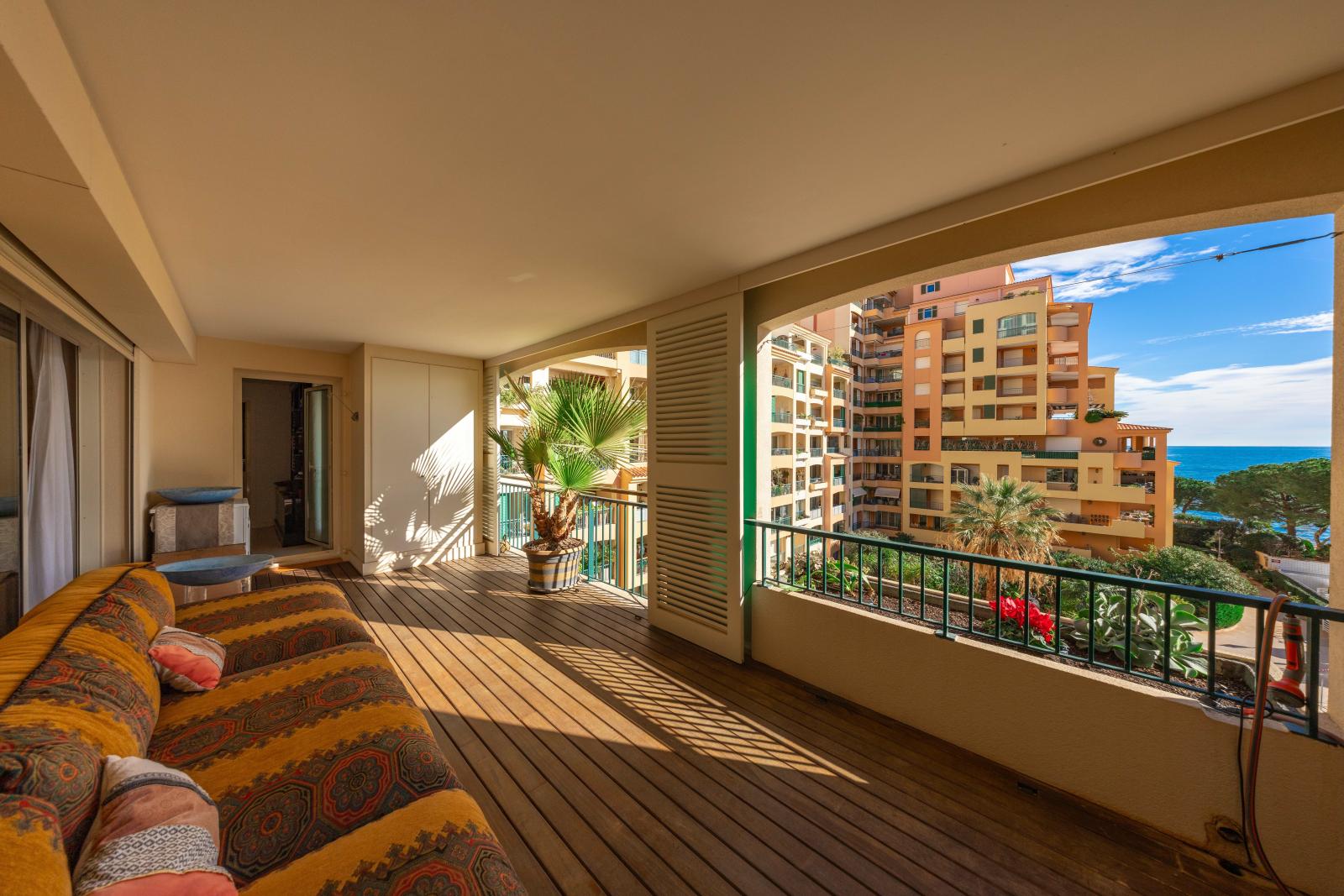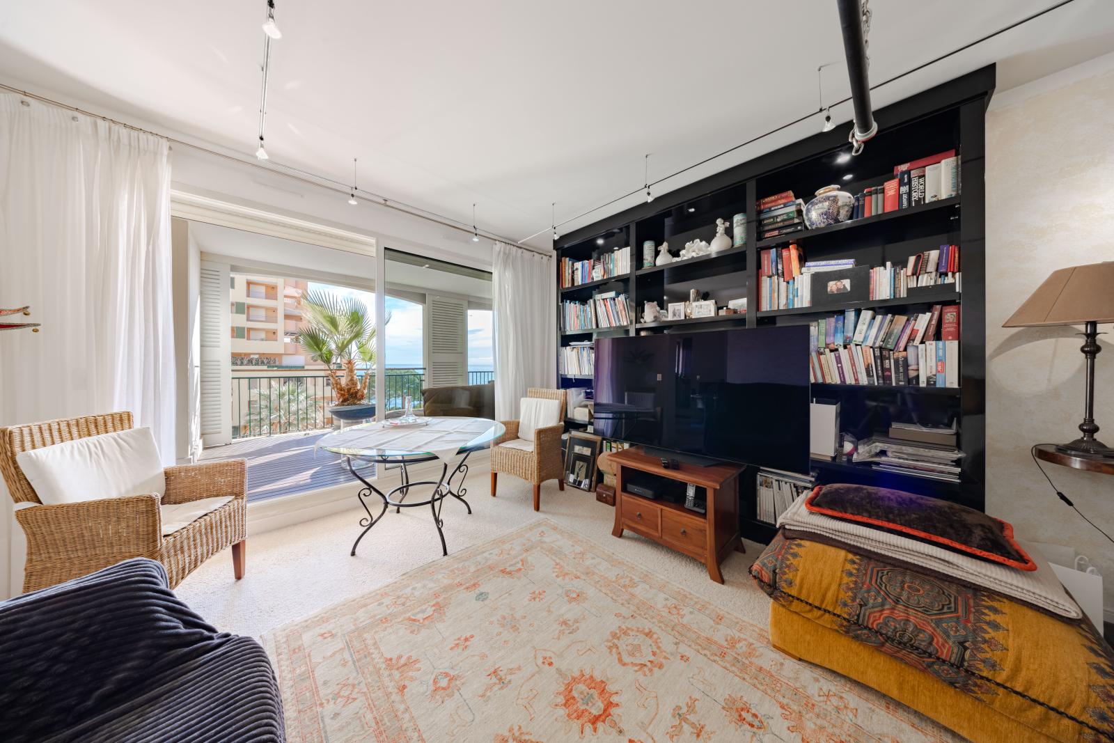 Superbe deux pièces entièrement rénové avec des matériaux haut de gamme, offrant une magnifique terrasse avec vue imprenable sur le Port Hercule, la Méditerranée et le Rocher de Monaco.
