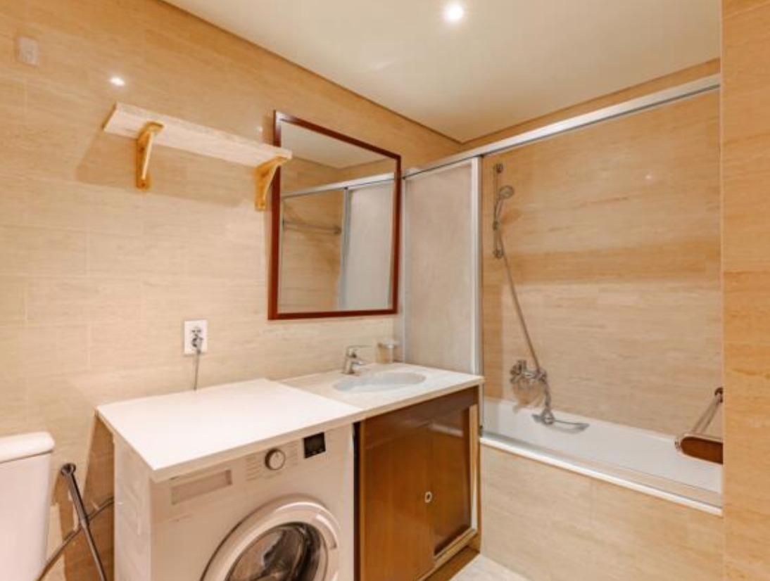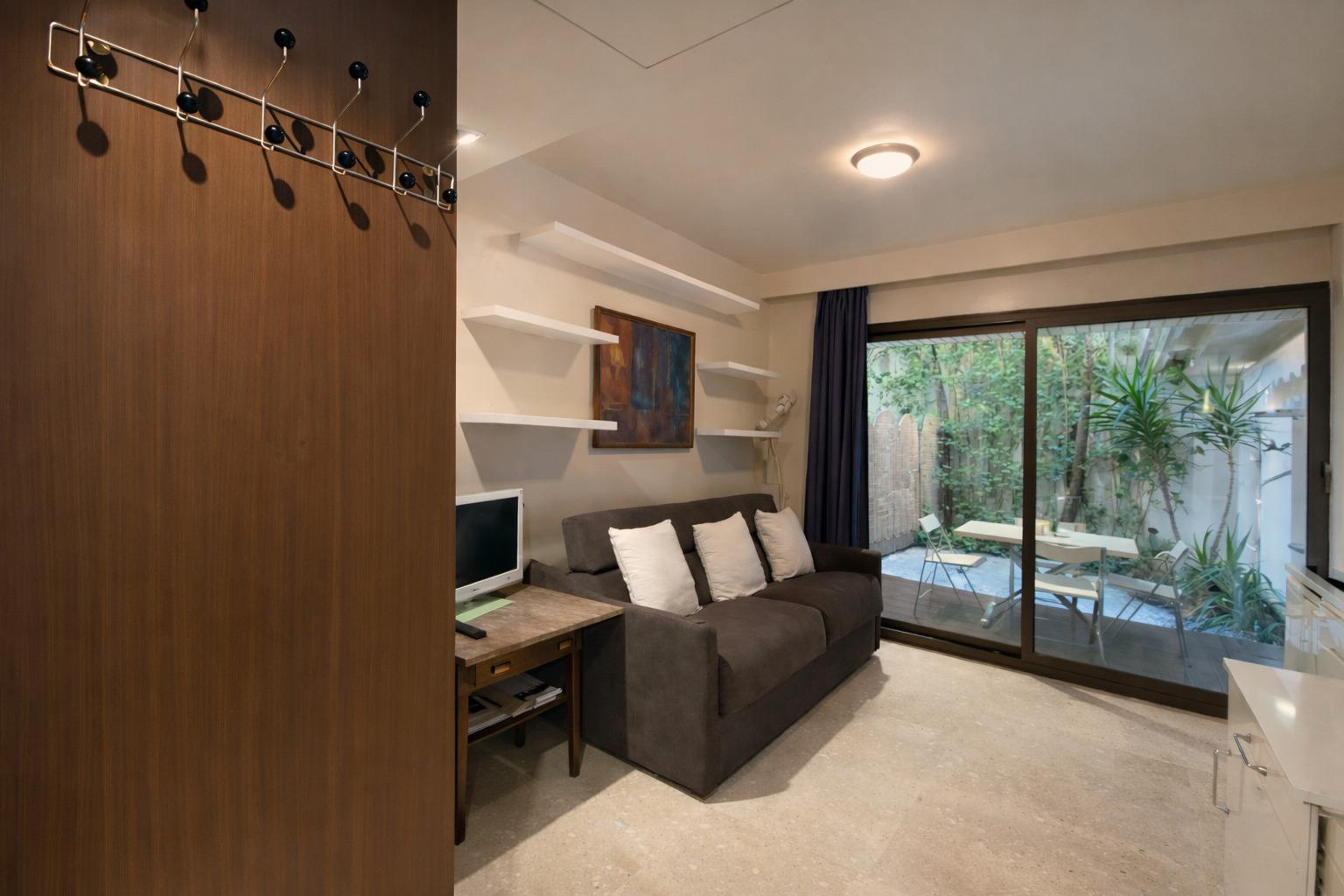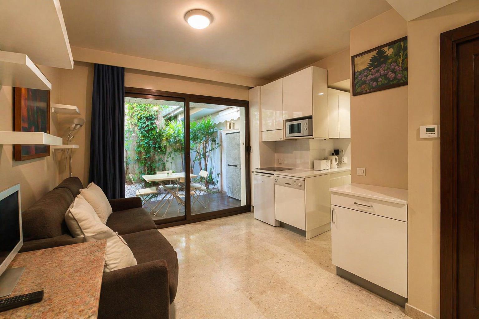 Entrée avec double porte, salon avec kitchenette, salle de bain spacieuse avec baignoire / douche, jardin privé d’environ 17 mètres carrés.