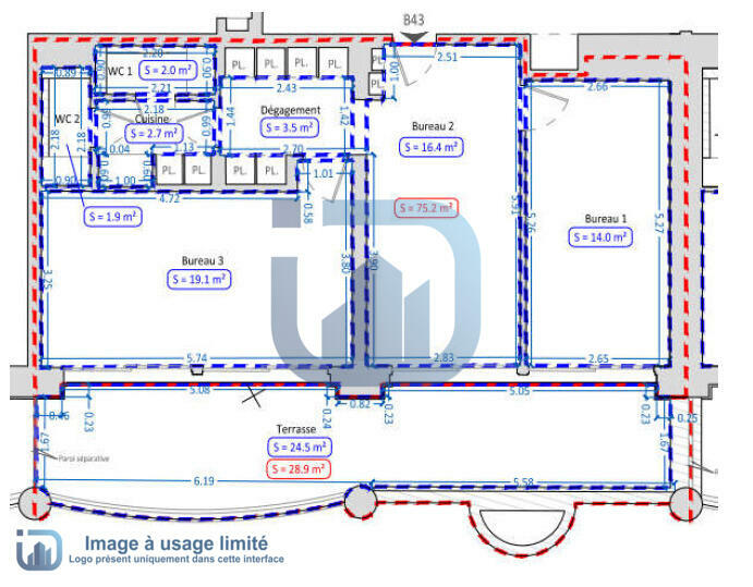Spacieux bureaux composés d'une pièce centrale, d'un bureau de direction, d'une grande salle de réunion, sanitaires hommes/ femmes, kitchenette, nombreux rangements, grande terrasse.