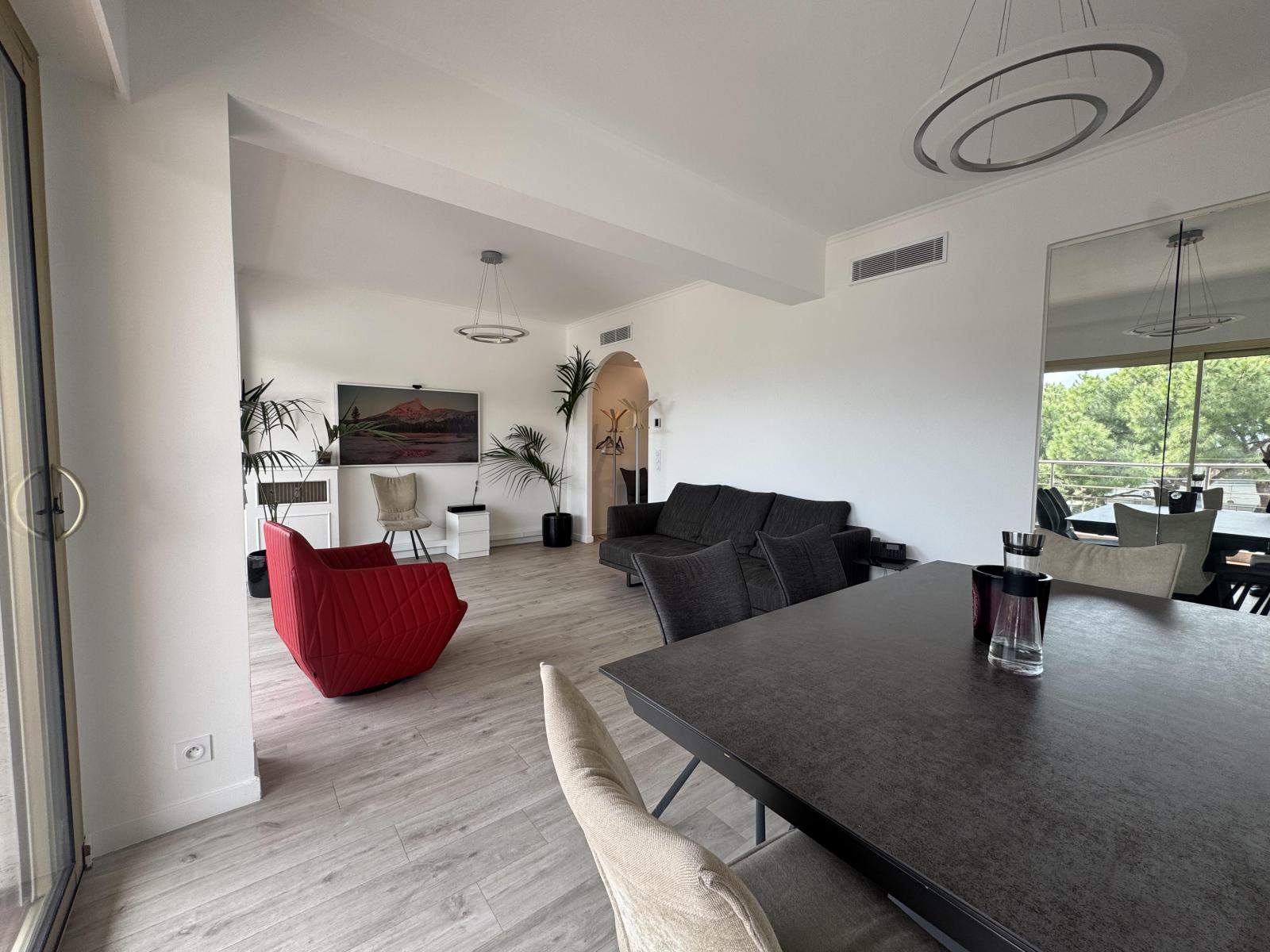 Ce bien d'exception se compose d'un séjour lumineux ouvert sur la terrasse, d'une cuisine équipée avec des finitions de luxe, et d'une spacieuse chambre avec dressing sur mesure. La rénovation complète a été réalisée avec une attention particulière, créant un espace de vie moderne et raffiné.