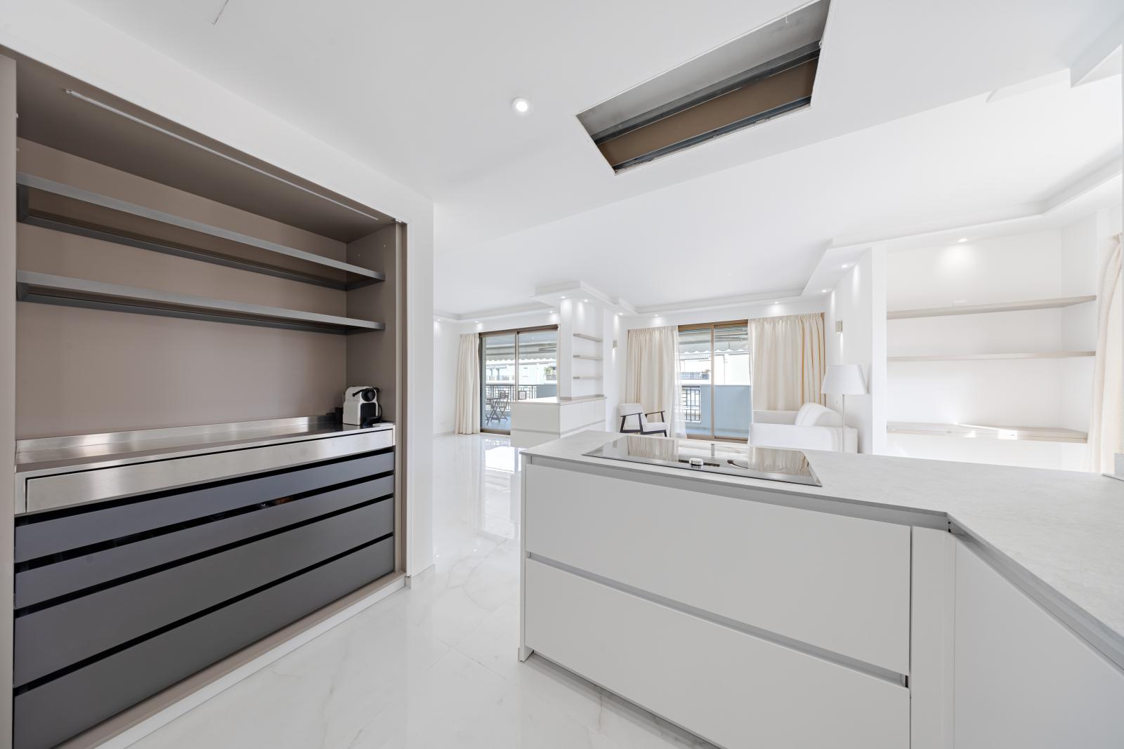 Ce bien d'exception se compose d'un séjour lumineux ouvert sur la terrasse, d'une cuisine équipée avec des finitions de luxe, et d'une spacieuse chambre avec dressing sur mesure. La rénovation complète a été réalisée avec une attention particulière, créant un espace de vie moderne et raffiné.