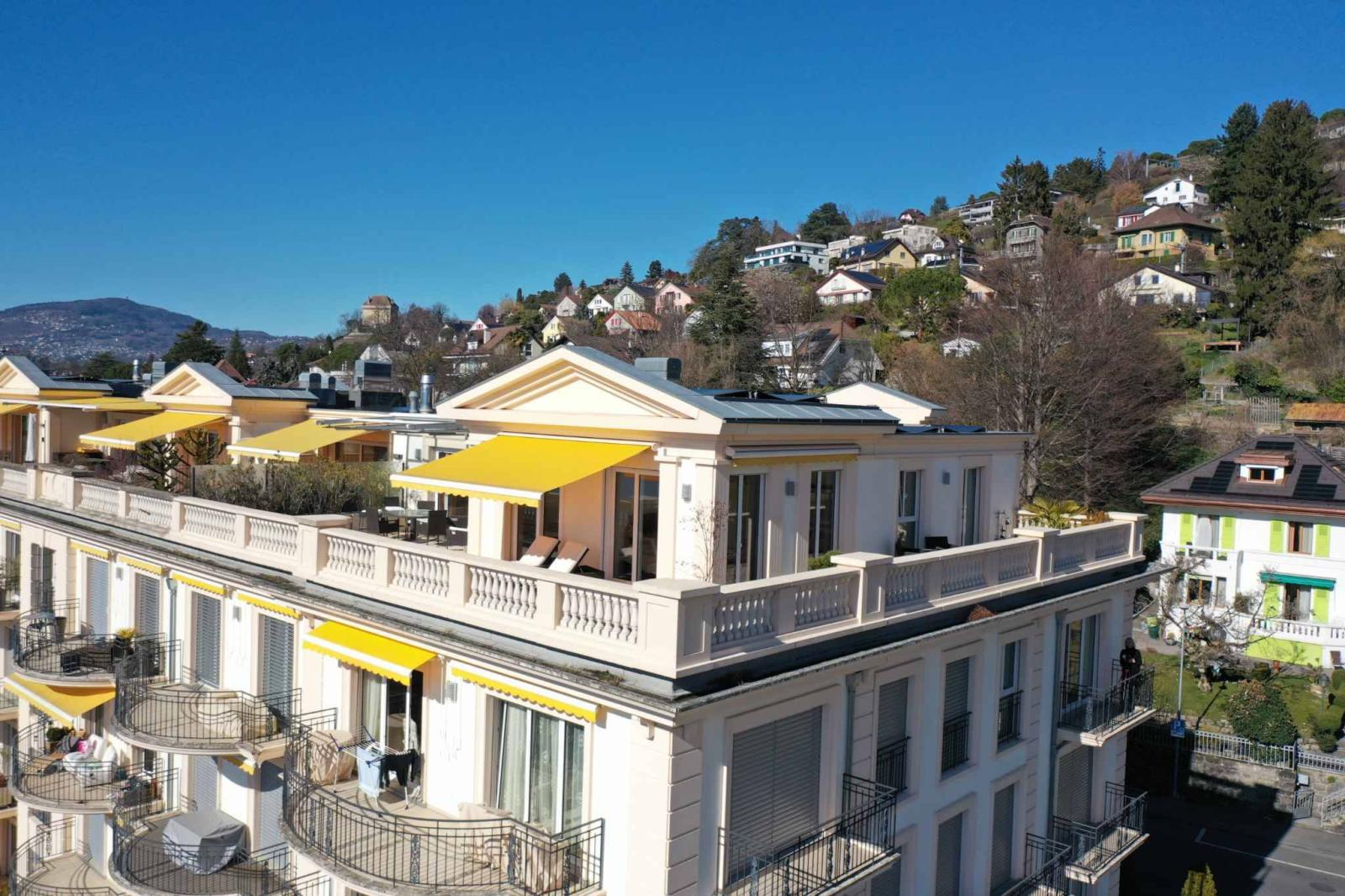 Situé au dernier étage d’une élégante résidence de standing d’inspiration Belle Époque, édifiée en 2008 au cœur de Montreux, ce somptueux attique en duplex offre environ 240 m² de surface pondérée (dont 199 m² habitables, complétés par 116 m² de terrasse et 3.6 m² de balcon). Il bénéficie d’un emplacement privilégié, à proximité immédiate de toutes les commodités, ainsi que d’une vue panoramique spectaculaire sur l’ensemble du bassin lémanique. L’ascenseur dessert directement l’appartement et permet un accès privatif à chacun des deux niveaux.