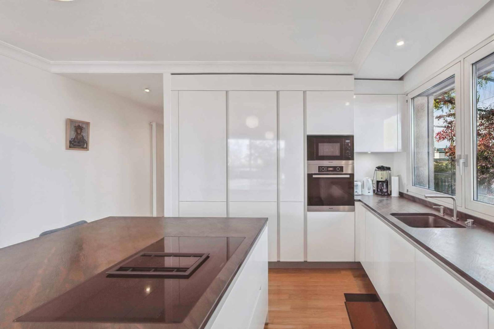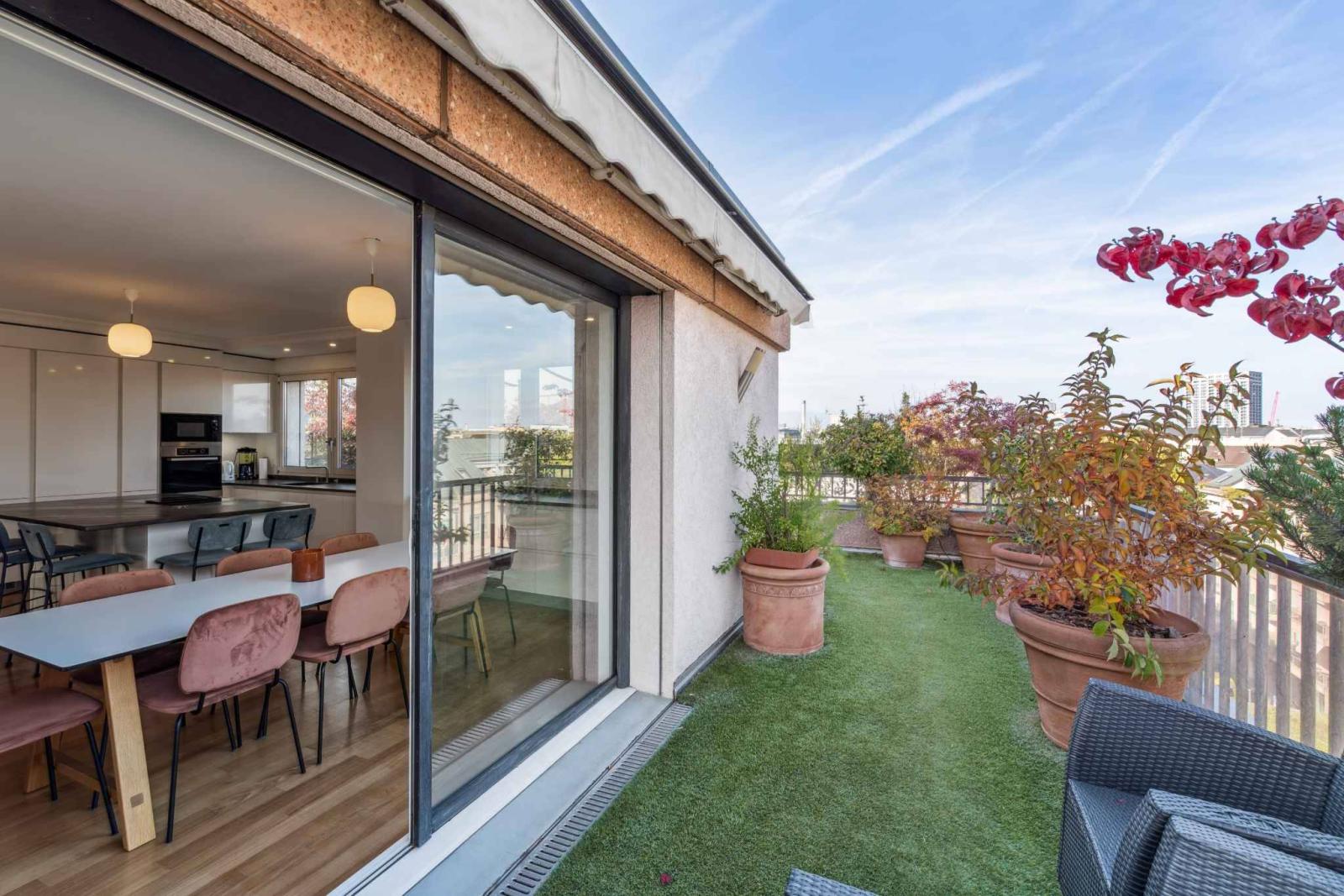 Sa vaste terrasse, accessible depuis toutes les pièces, offre une vue panoramique imprenable sur la ville et le Salève.