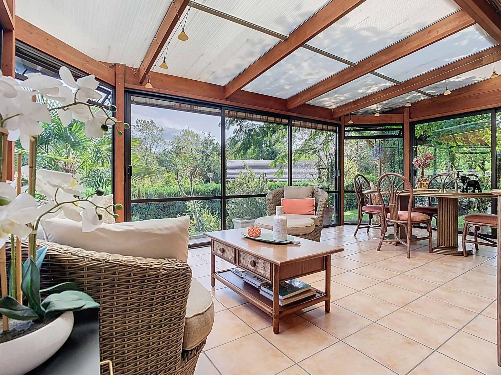 À l’extérieur, le jardin joliment arboré s’organise autour de la piscine, bordé d’arbres et de massifs qui dessinent des espaces aux ambiances variées. Les terrasses et les coins de verdure invitent aussi bien au repos qu’aux moments partagés, offrant une continuité naturelle entre la maison et son environnement. L’exposition plein sud assure une lumière généreuse qui accompagne la vie au jardin du matin jusqu’au soir.