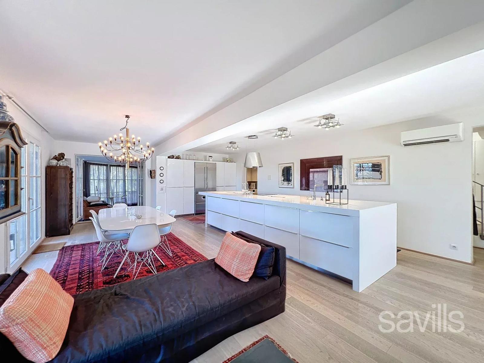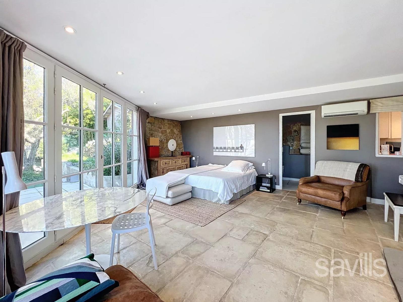 À Mougins, au cœur d’un domaine privé, fermé et sécurisé, cette élégante villa de 250 m² offre un cadre de vie paisible et raffiné, à quelques pas de l’étang de Fontmerle, des commerces, des écoles et des grands axes routiers. Baignée de lumière, sans vis-à-vis, elle bénéficie d’une exposition idéale et de superbes vues dégagées sur les collines environnantes. Dès l’entrée, un vaste hall avec vestiaire mène à un séjour lumineux doté d’une cheminée, de poutres apparentes et d’une belle hauteur sous plafond. La salle à manger s’ouvre sur une cuisine indépendante, moderne et fonctionnelle, avec buanderie attenante. Le rez-de-chaussée comprend deux chambres, dont une belle suite parentale de 27 m² avec salle de bains et toilettes, ainsi qu’une seconde chambre avec sa salle de bains privative. Un grand bureau, baigné de lumière et ouvert sur le jardin, constitue un espace idéal pour le télétravail. À l’étage, deux chambres supplémentaires profitent d’une vue panoramique sur le massif de l’Esterel et partagent une salle de douche avec WC. Le sous-sol accueille une chambre de service avec salle d’eau, trois caves, un atelier, ainsi qu’un vaste garage de près de 70 m². À l’extérieur, le terrain de 1 700 m² paysagé avec soin abrite une piscine au sel chauffée, un pool house avec cuisine d’été, de vastes terrasses et une végétation méditerranéenne généreuse. Située dans un lotissement de 14 lots sans procédure en cours, cette propriété allie calme absolu et proximité des commodités, avec des charges annuelles limitées à 300 €. Un bien rare à quelques minutes de Cannes, Nice et de l’aéroport international.