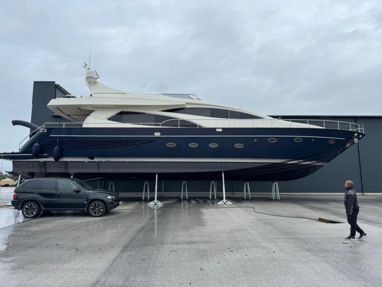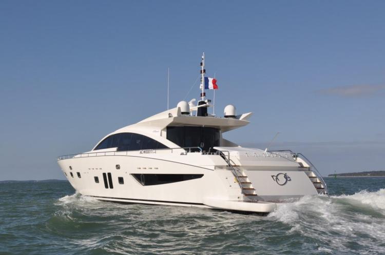 2 treuils à l'arrière - passerelle escamotable hydraulique - taud bimini hydraulique - bossoir pour annexe au fly - hangar pour jet ski au tableau arrière